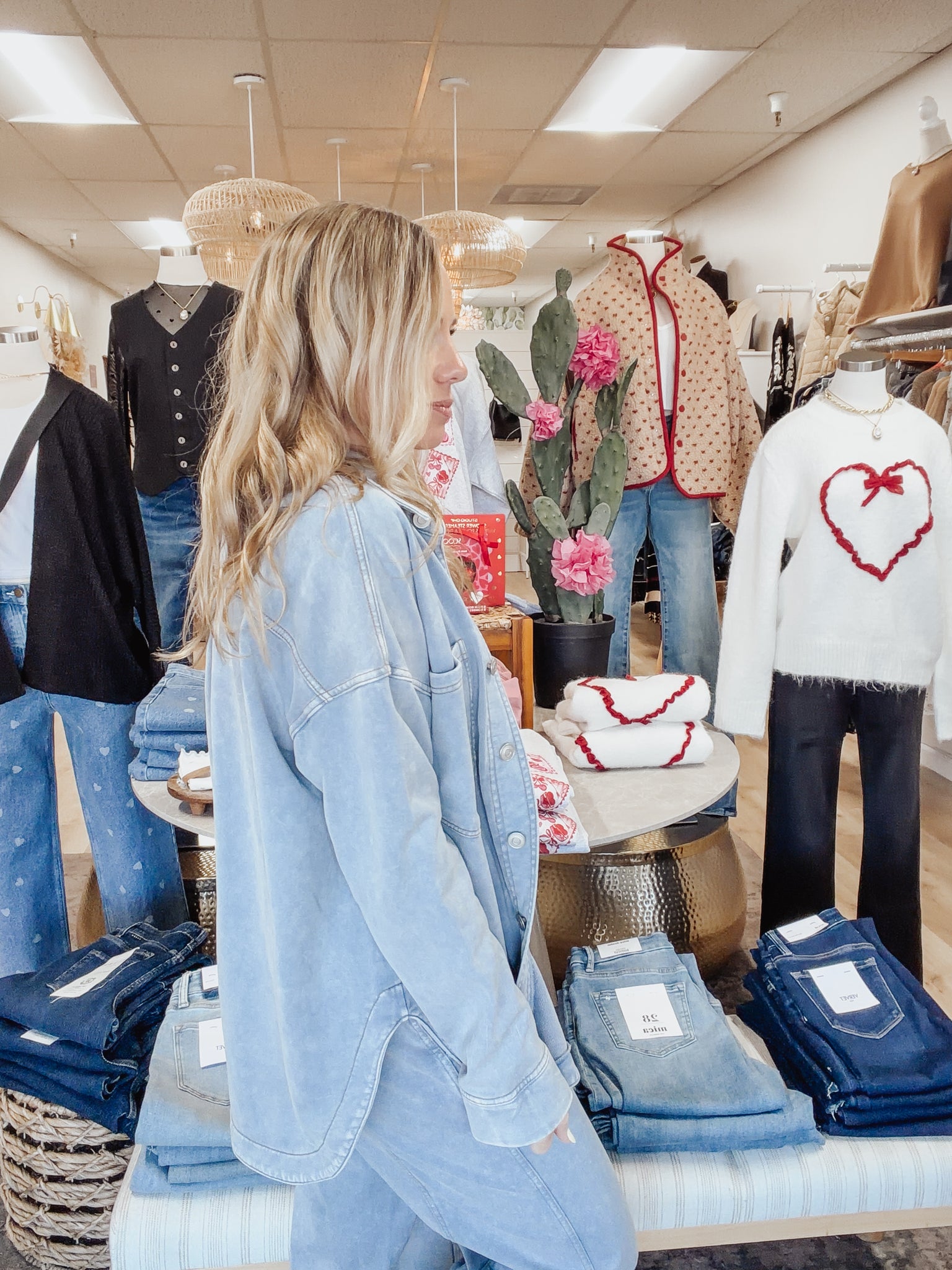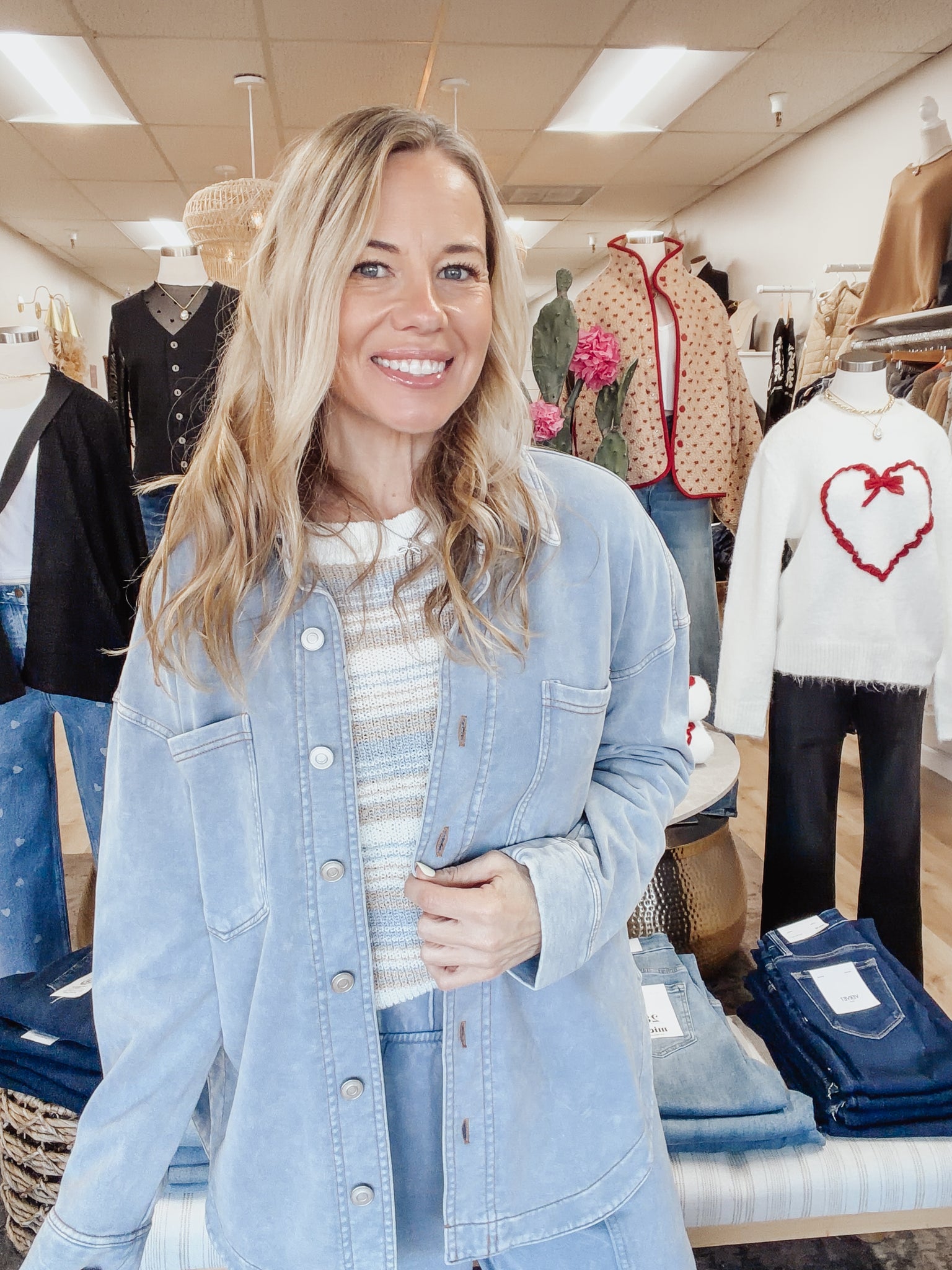 The layer you’ll grab all season long. The Skyline Soft Denim Shacket features a relaxed, oversized fit with a soft-washed blue finish that gives it that perfectly broken-in feel. Designed with a button-front closure, chest pockets, and lightweight structure, it’s ideal for effortless layering.