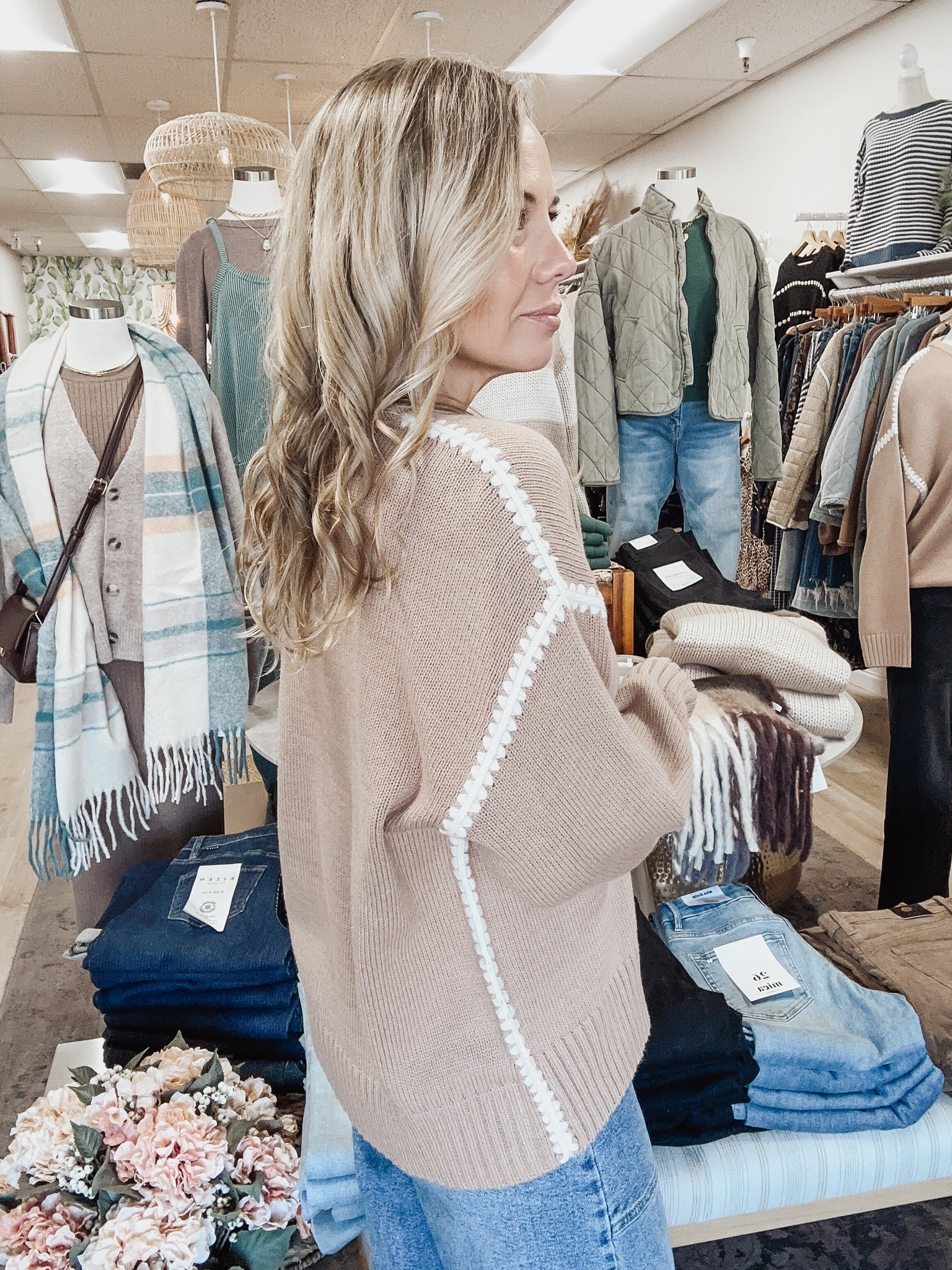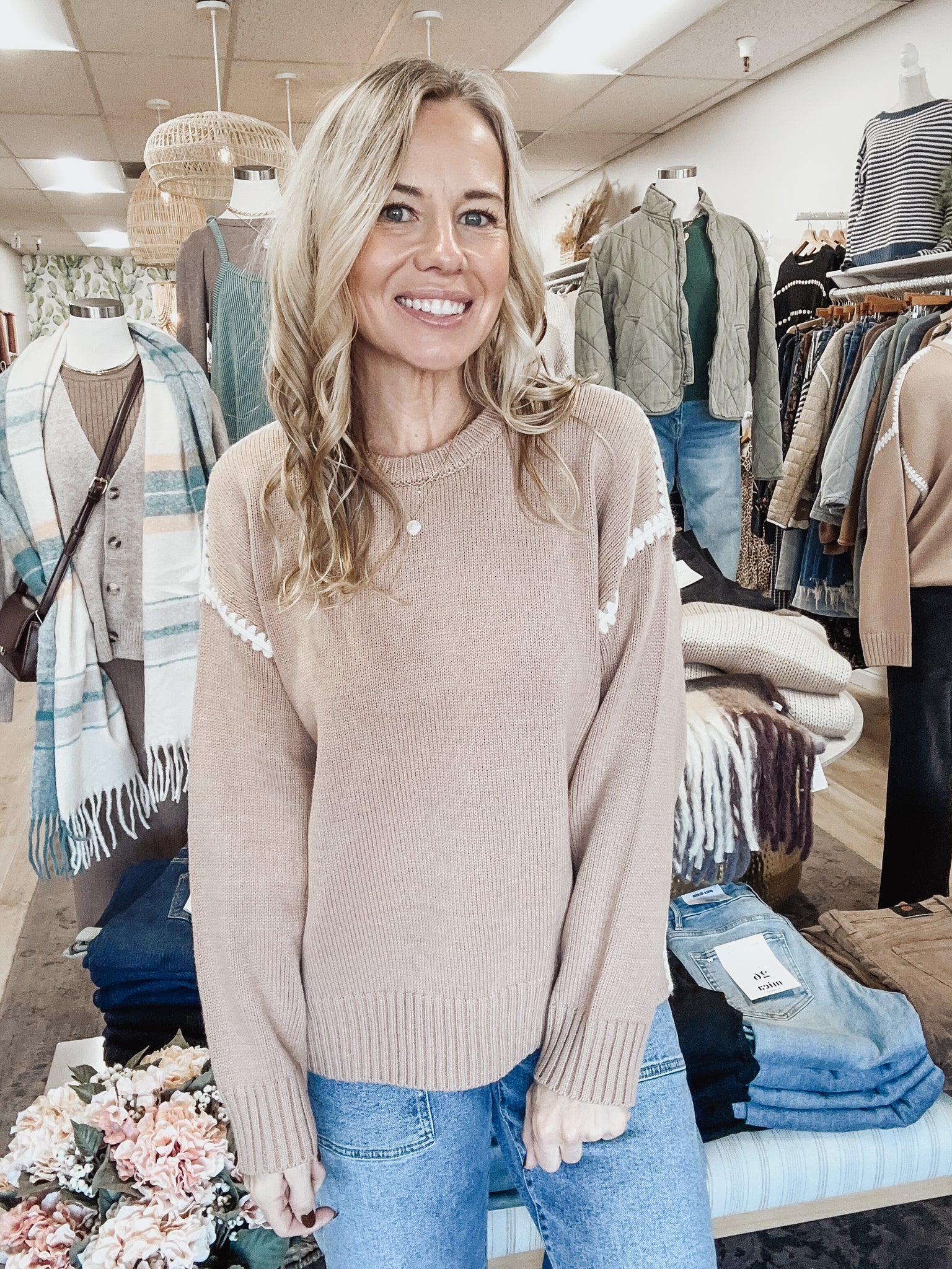 The Softspoken Stitch Sweater is an elevated everyday knit with thoughtful details that make it special. Designed in a soft, cozy sweater knit, this piece features a classic crew neckline, relaxed fit, and delicate contrast stitching along the shoulders and sleeves for a subtle touch of charm.