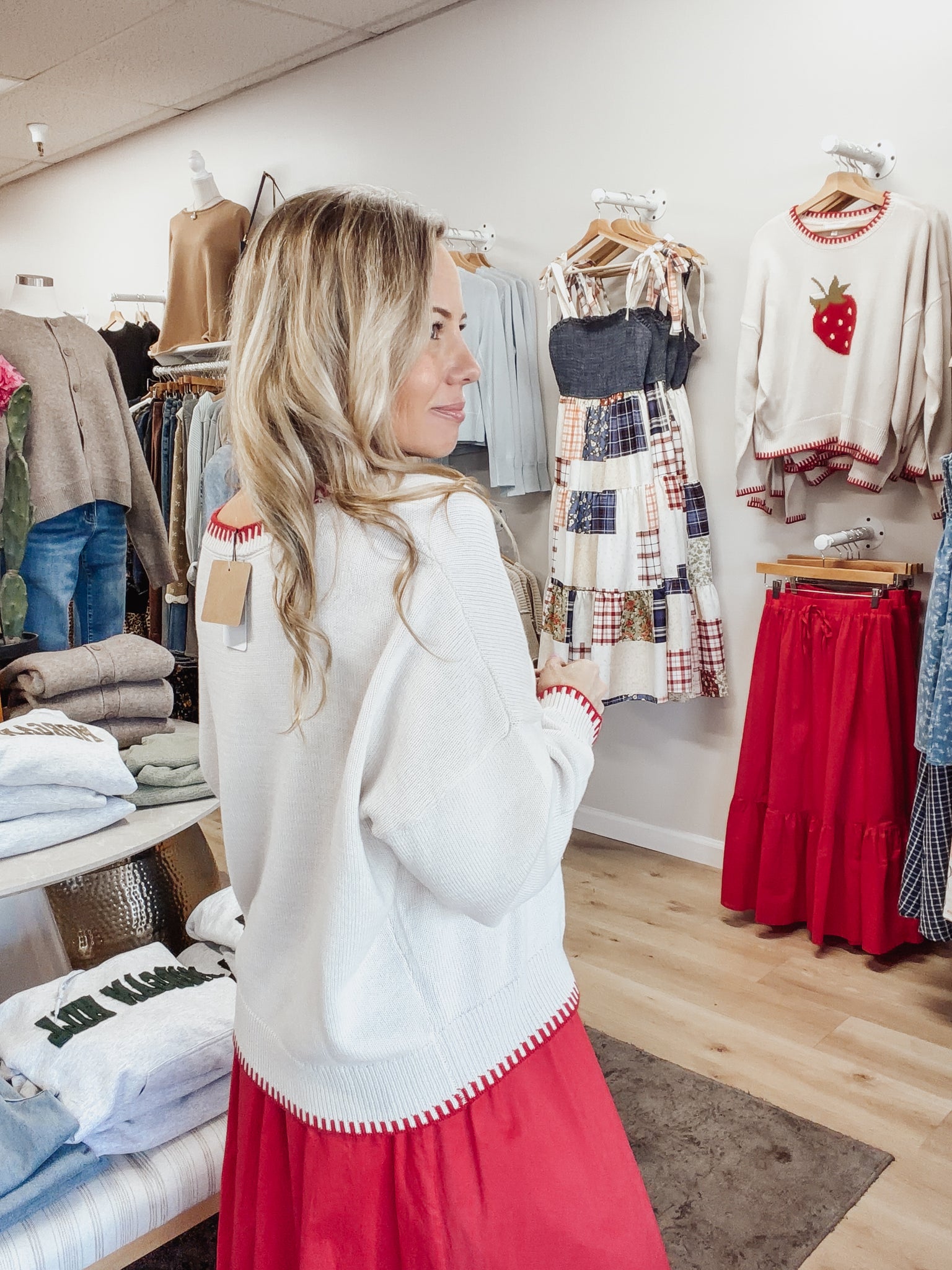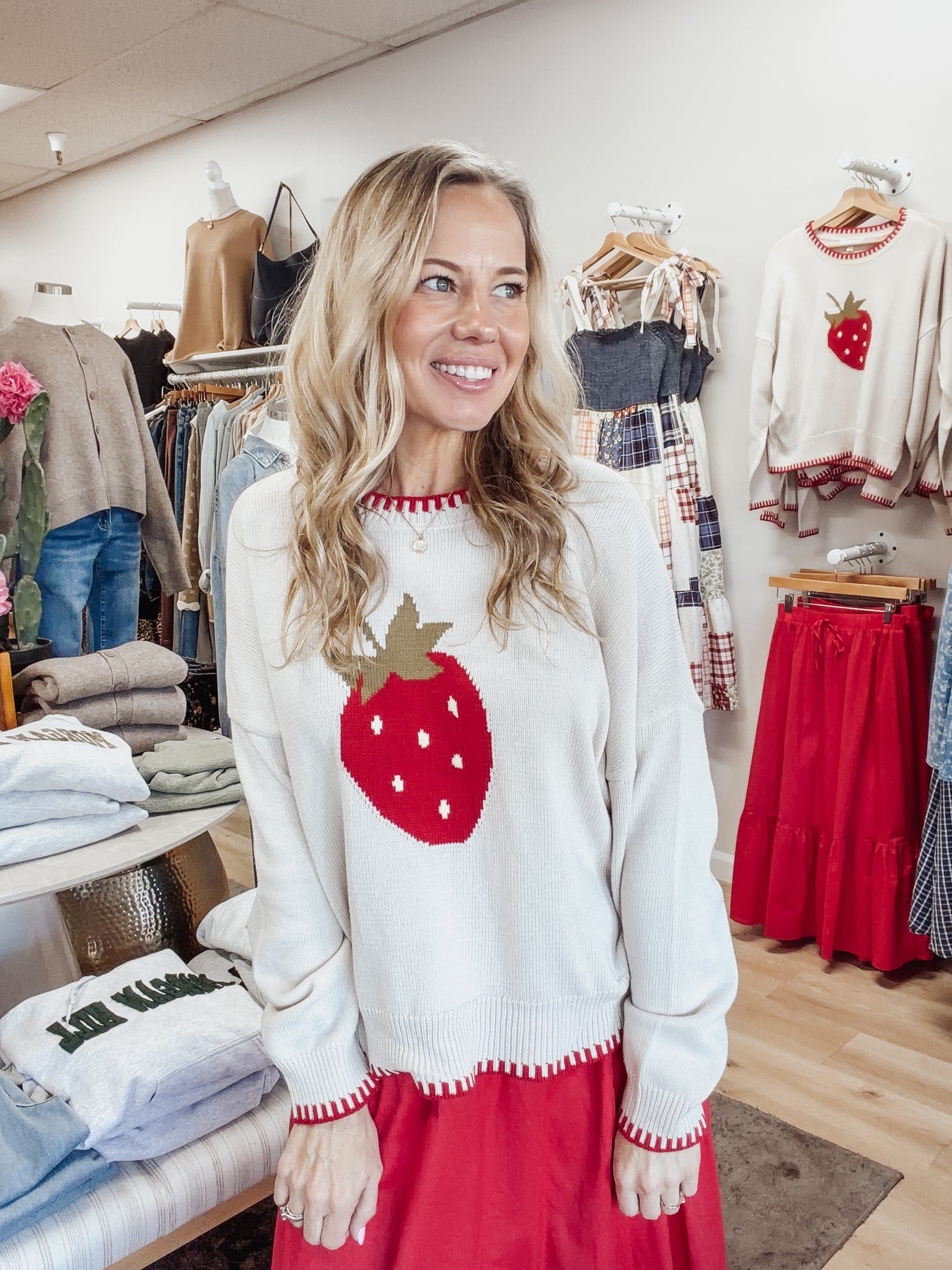 The Strawberry Fields Knit Sweater is pure charm. Designed with a classic knit silhouette and a bold strawberry motif, this sweater brings a playful pop while still feeling timeless. Finished with contrast trim at the neckline, cuffs, and hem, it’s cozy, cheerful, and easy to style with denim or a cotton skirt for an effortlessly cute look.