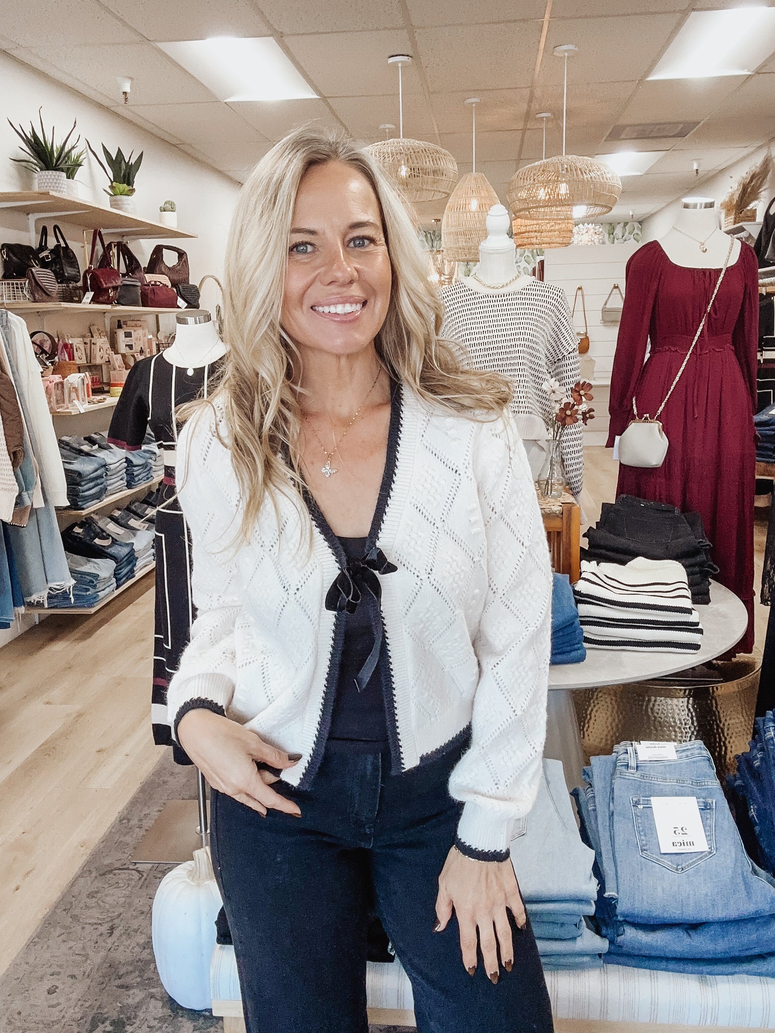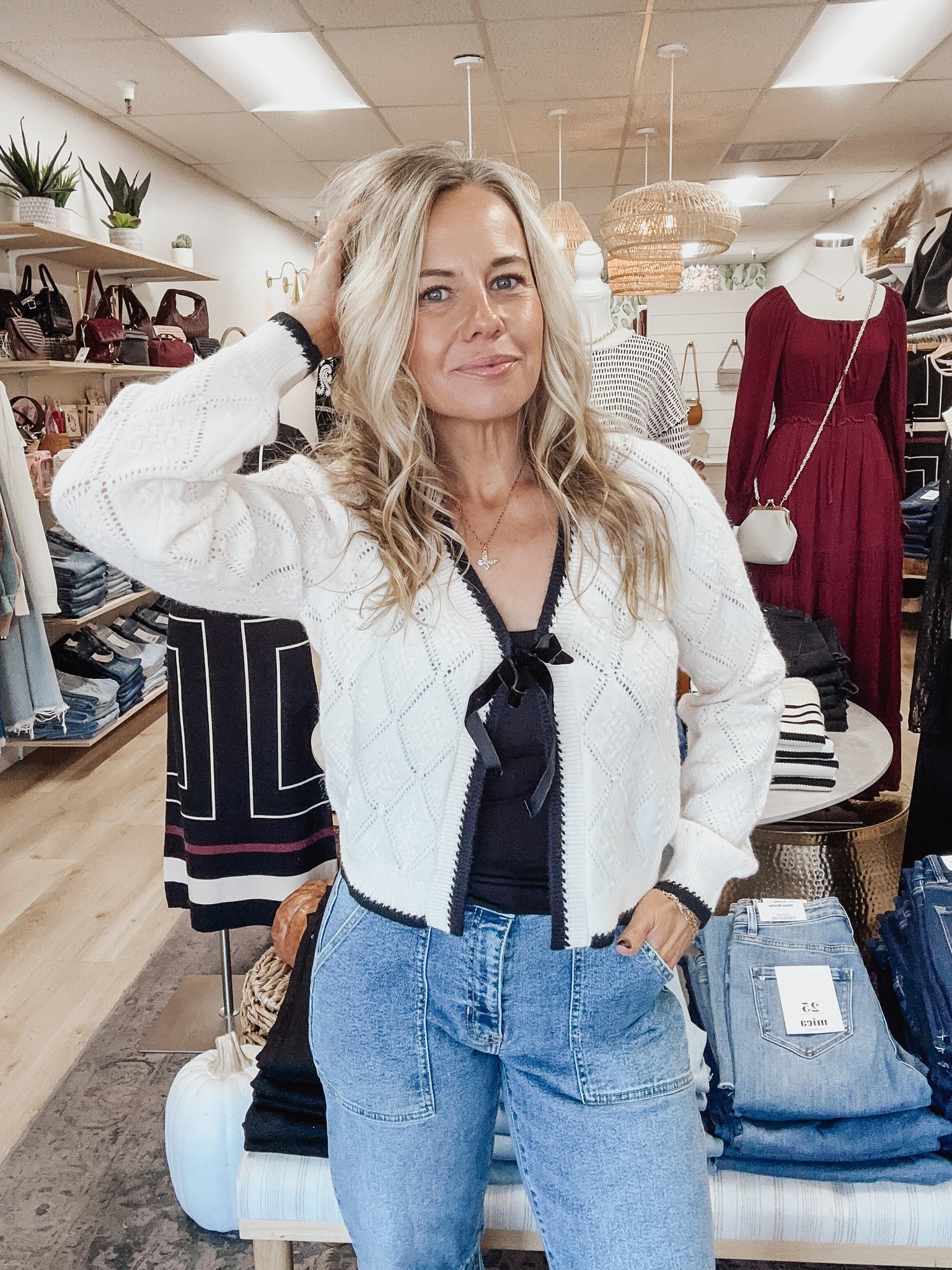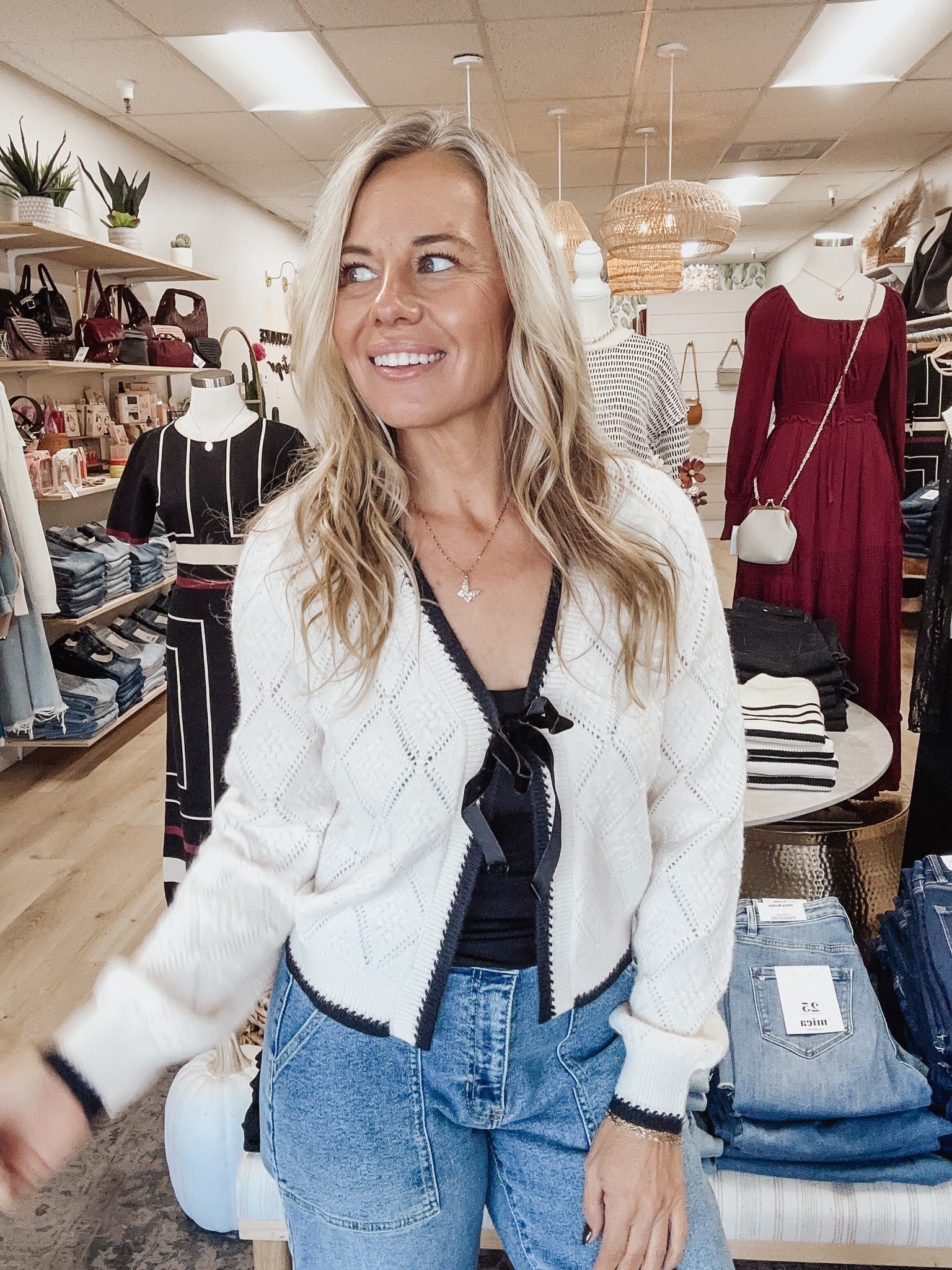 Soft, feminine, and perfectly detailed, the Velvet Bow Charm Cardigan is a cool-weather must. The ivory knit features an allover diamond stitch pattern with delicate texture and a contrast trim along the edges and cuffs. A black velvet tie at the neckline adds a touch of charm and makes this piece feel extra special. Style it over a tank and denim for a casually polished look, or dress it up with a slip skirt and boots for a night out. Model is wearing a medium.