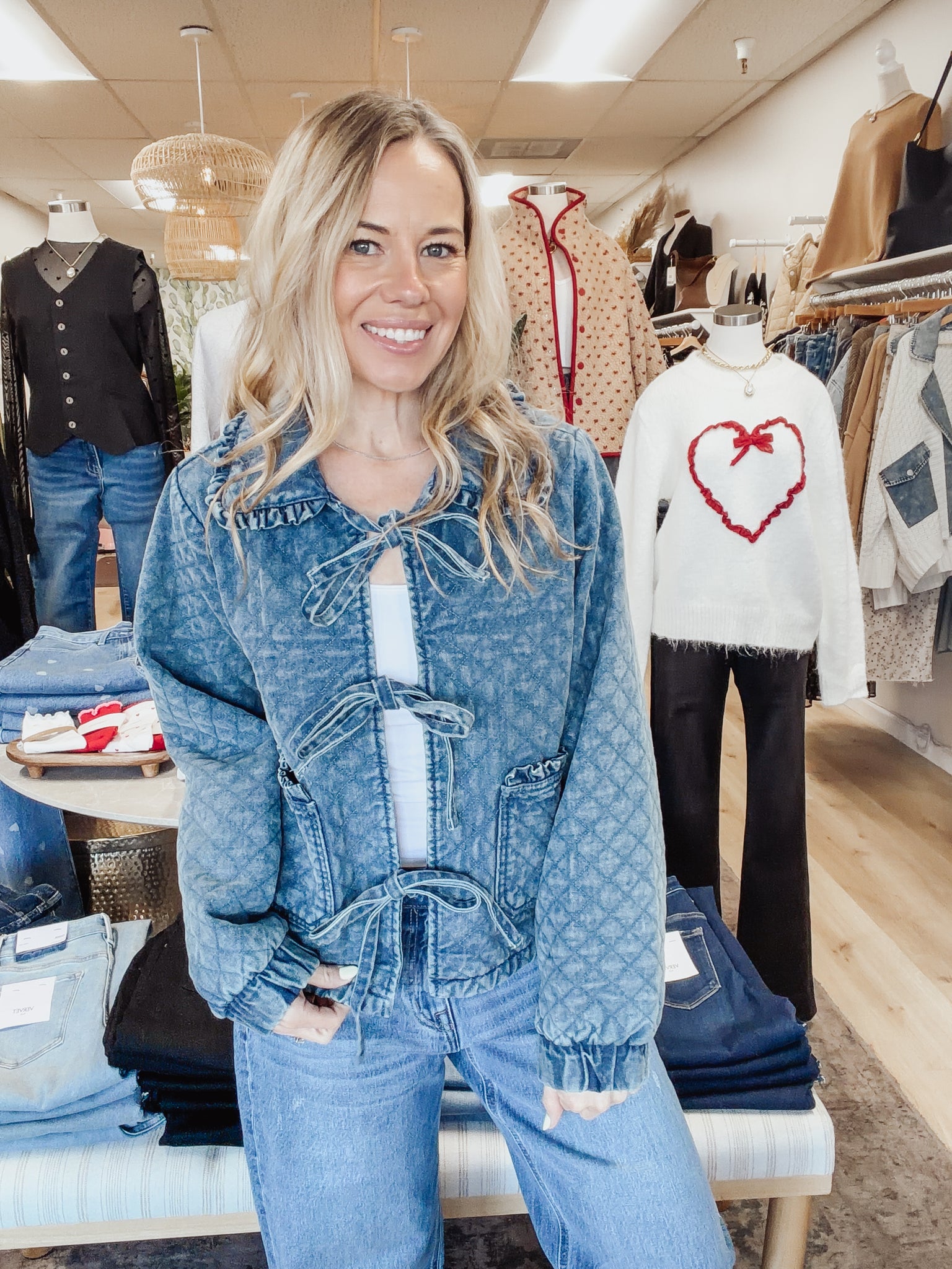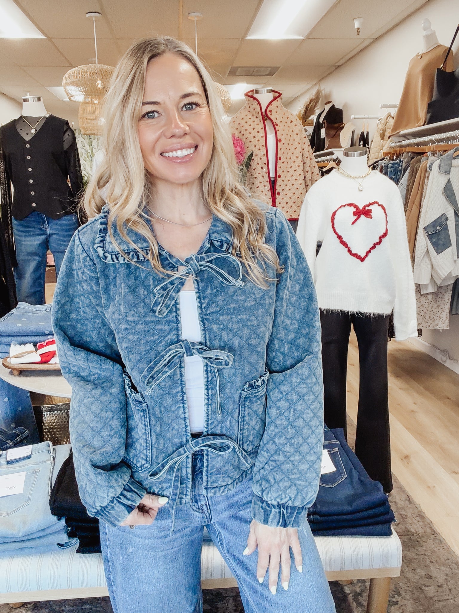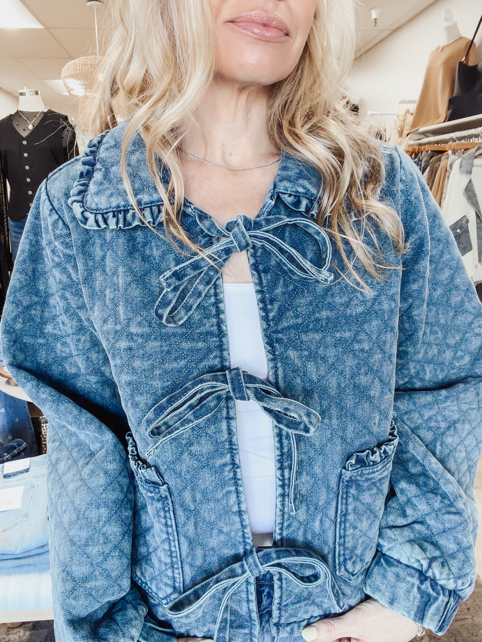The Winfield Quilted Denim Tie Jacket brings a fresh take on classic denim layering. Designed with a soft quilted texture, feminine tie-front closures, and subtle ruffle trim at the neckline and pockets, this piece feels both polished and easy. The relaxed fit makes it ideal for layering over tanks and tees, while the lightweight denim fabric transitions seamlessly from day to night. Pair it with your favorite jeans for an effortless double-denim moment or throw it on over a dress for a casual-cool finish.
