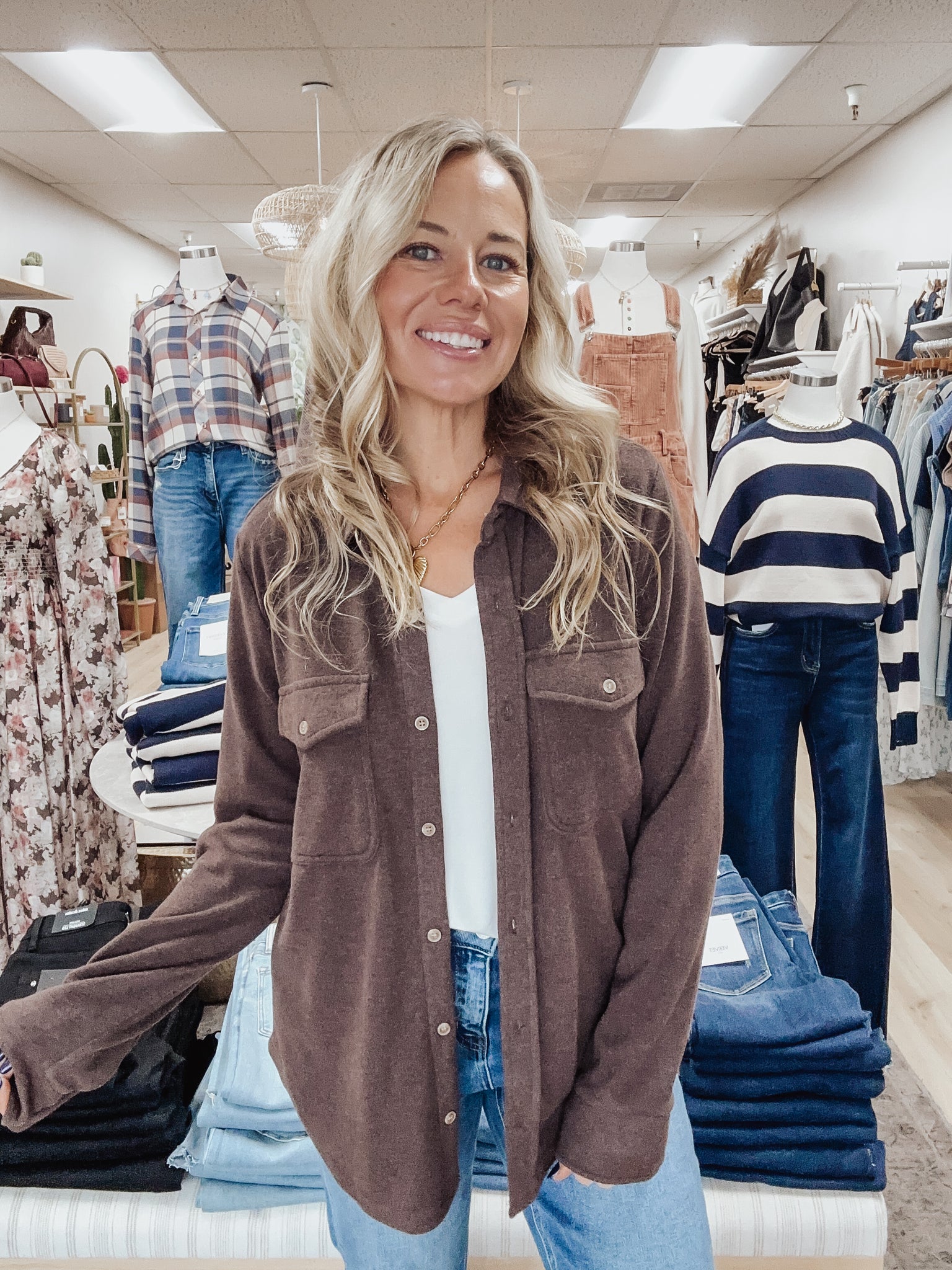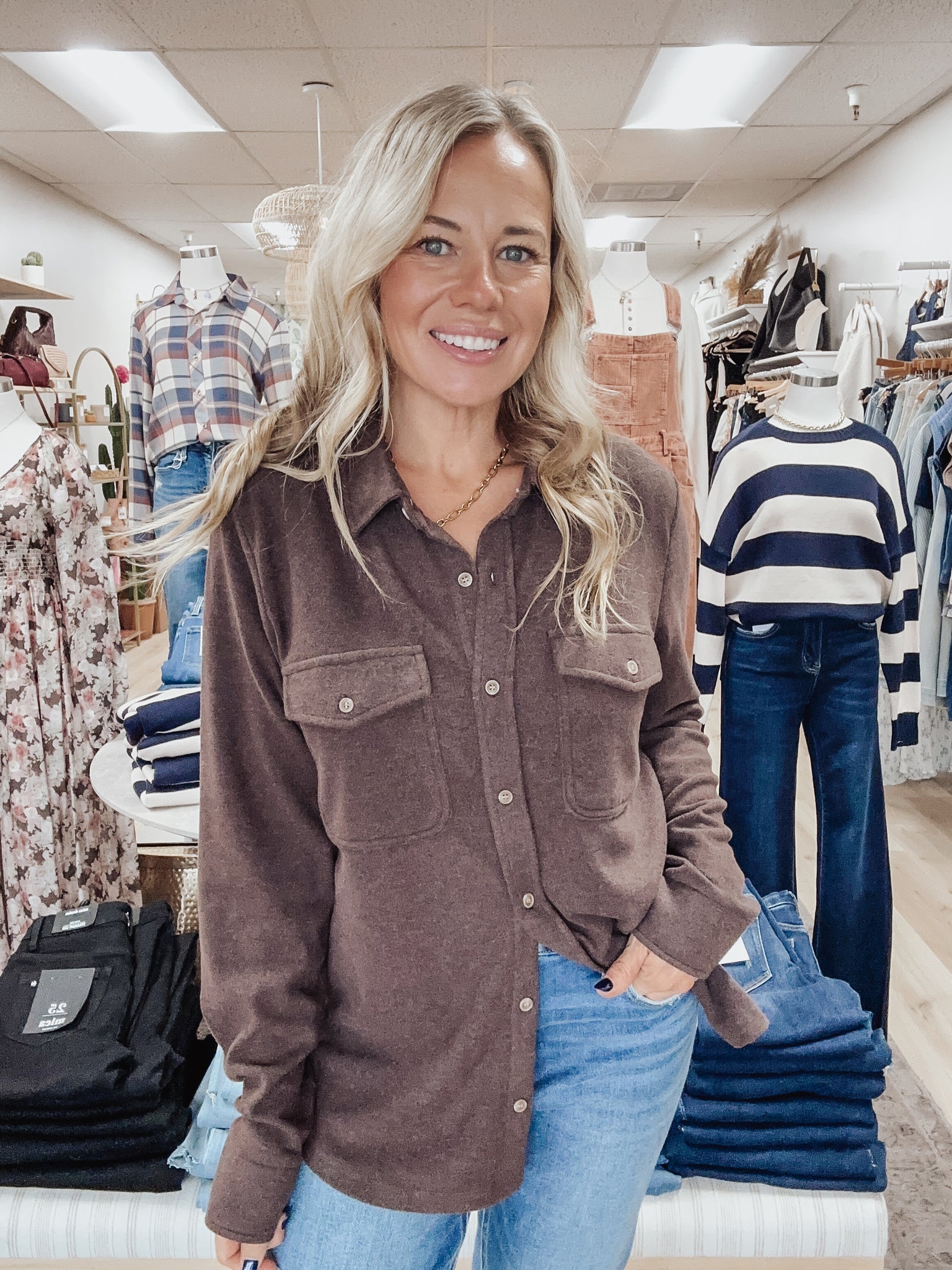 The Woodland Cozy Button Down is that easy layering piece you’ll live in all season. Made from an ultra-soft knit with a relaxed, slightly oversized fit, it’s perfect worn open over a tank or buttoned up for a cozier feel. The deep coffee bean shade adds a timeless, earthy vibe that pairs effortlessly with denim, joggers, or even over a casual dress. Model is wearing a medium